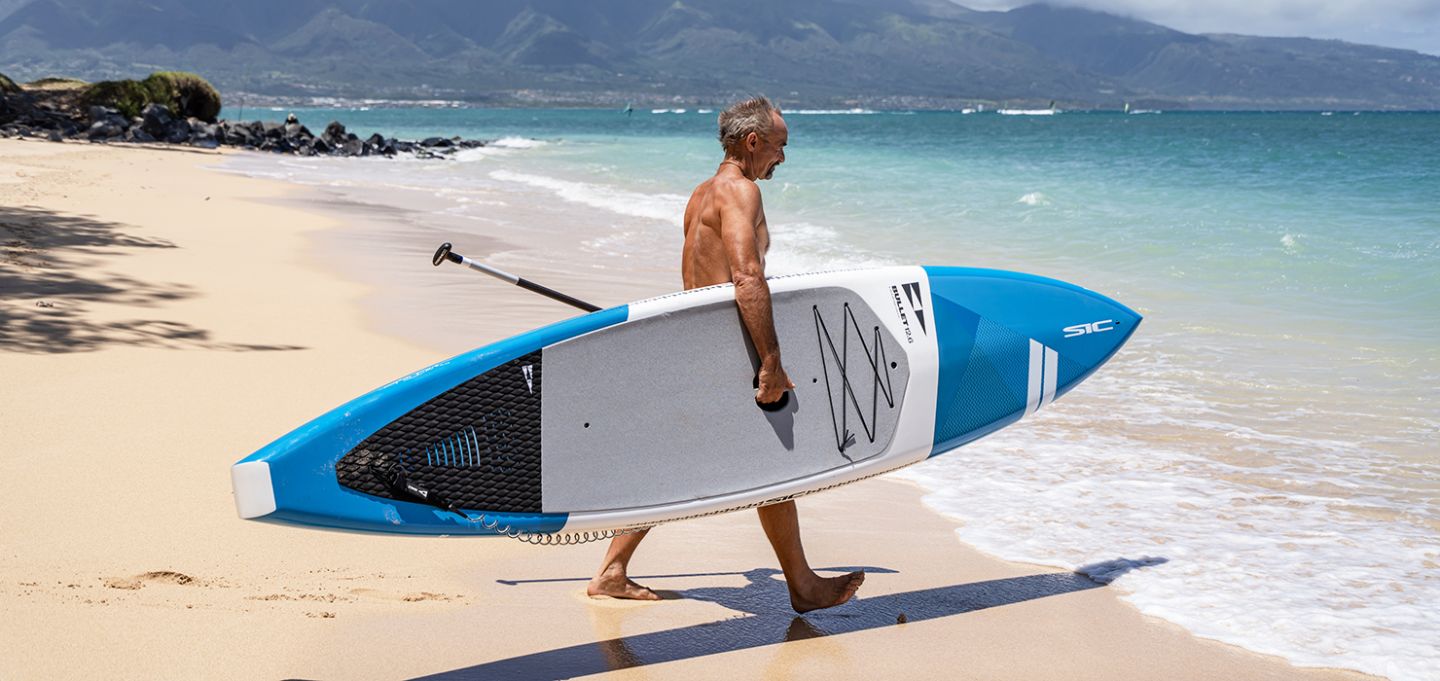 The Bullet's colours and graphics will tempt any downwind enthusiast. The Bullet is one of the most versatile designs in the SIC paddleboarding range. In addition to being a tremendous downwind board, it's a fitness and touring board that can drop in and surfs ocean swell as well as beach and point breaks.